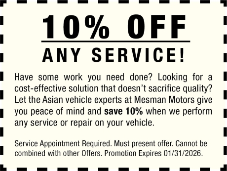 At Mesman Motors, YOU are our TOP priority. We are a small, family-owned shop. We will listen to and document, in detail, your needs and concerns. We aim to provide friendly, personable, responsive customer service.
